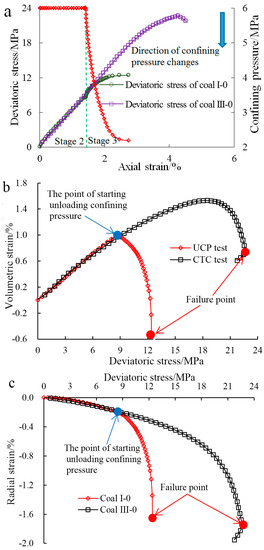 Figure 6 presents the stress–strain process of coal I-0 and III-0. In Figure 6a, the stress–strain curves of coal I-0 and III-0 at Stage 2 have a high uniformity. Until Stage 3, the peak of deviatoric stress (coal I-0) reduces compared to the peak of deviatoric stress (coal III-0). This reveals damage due to unloading confining pressure is more obvious, leading the coal specimen to be prone to failure. In addition, the UCP test has no elastic deformation stage. After starting the UCP, the deviatoric stress-axial strain curve is protruding and its yield point is not clear. At the point of the coal failure, the UCP test has lower axial strain (Figure 6a) and volumetric strain than the CTC test (Figure 6b). The radial strain of the UCP test is similar with that of the CTC test (Figure 6c). The larger radial strain of coal during unloading confining pressure (Figure 6c) causes more damage and larger volume expansion (Figure 6b). This may lead the poorer mechanical strength and the lower ability for ductile deformation of the coal specimen of UCP.