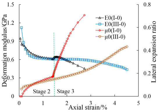 Change of the deformation modulus and lateral expansion ratio of coal I-0 and III-0 (Stage 2 and Stage 3 in reference to Stress Path II).