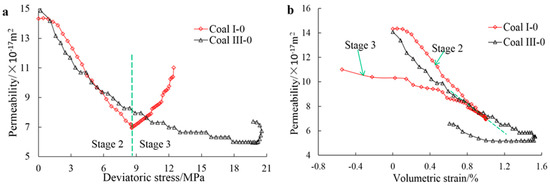 Permeability evolution of coal I-0 and III-0 (Stage 2 and Stage 3 with reference to Stress Path II): (a) permeability-deviatoric stress curve; (b) permeability-volumetric strain curve.