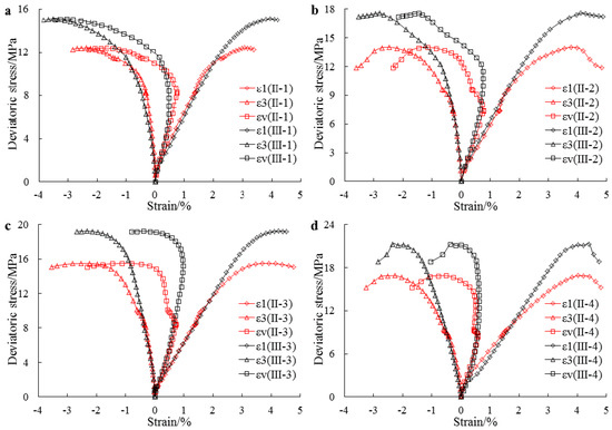Stress–strain of the coal specimens: (a) for coal II-1 and III-1; (b) for coal II-2 and III-2; (c) for coal II-3 and III-3; (d) for coal II-4 and III-4.