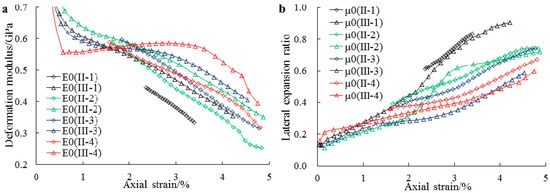 Change of deformation modulus (a) and lateral expansion ratio (b) with the axial strain.
