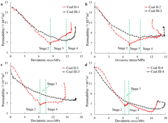 Permeability evolution with deviatoric stress: (a) for coal II-1 and III-1; (b) for coal II-2 and III-2; (c) for coal II-3 and III-3; (d) for coal II-4 and III-4 (Stage 2, Stage 3, and Stage 4 with reference to Stress Path II).