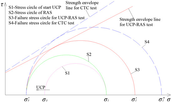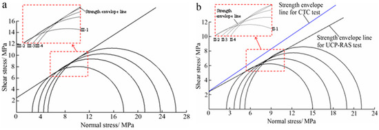 Mohr’s stress circle of coal specimens: (a) under the CTC test; (b) under the UCP-RAS test.