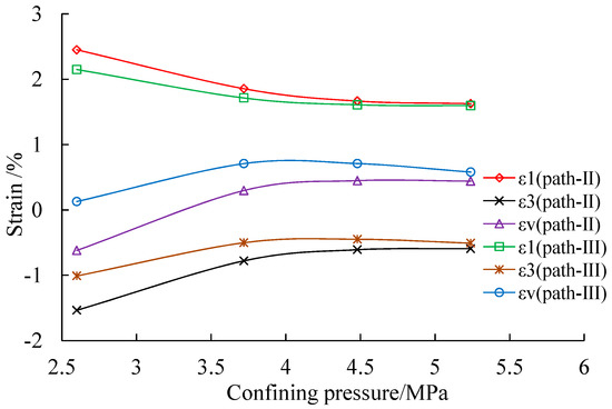 Unloading confining pressure damages the rock materials to some extent [4]. Figure 16 presents the Mohr’s circles of coal in Stress Paths II and III. For the stress state of Stress Circle S2, the axial stress increases from hydrostatic pressure of σ3 to σ1 and the confining pressure decreases from σ3 to under Stress Path II while Stress Path II is a simple increase of axial stress from to σ1. Figure 17 presents the strain of coal specimens at the stress state of Stress Circle S2. It is clearly seen that the strains of the coal specimens under Stress Path II are all greater than these under Stress Path III. This may be due to the vertical fractures being more sensitive to the confining pressure. UCP can lead to the production of a sharp increase of radial strain, resulting in untightening of the pores, voids, and fractures along the vertical direction under an initial deviatoric stress.