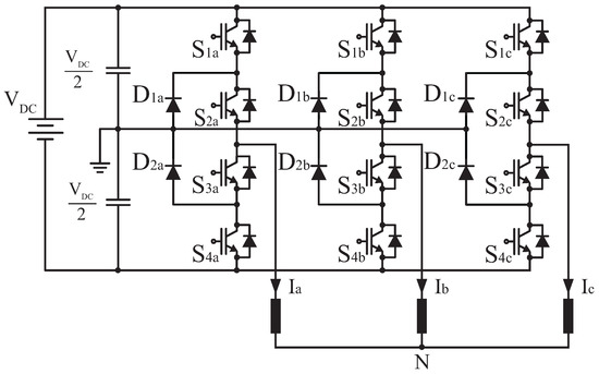 An advantage of the multilevel NPC inverter topology is that voltage stresses across the switches are reduced due to a greater number of switching devices and voltage levels. An appropriate selection of switching vectors also reduces harmonic currents generated by the inverter [36,37].