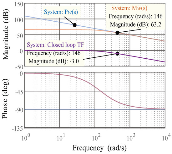 Figure 8 shows the Bode plots for the system in the DC voltage control loop. The transfer function for the DC voltage is a single integrator, according to (19). After adding an additional control feedback loop, the improved plant of the DC voltage now contains an artificial pole at 146 rad/s. This pole was selected to provide load disturbance rejection according to the closed loop dynamics, by means of a real pole. The Bode plot for the closed loop transfer function shows that the the DC controller loop performance is a first order transfer function.