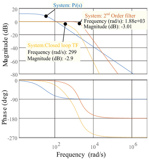 Figure 9 shows the Bode plots of the system in the current control loop. The transfer function for the plant that defines the current dynamics is a first order system. The closed loop transfer function includes the transfer function for the PI controller in cascade with a second order filter used to remove the AC components of the d-q harmonic currents. However, at the frequency of interest (299 rad/s), the dominant dynamics are mainly due to the plant and the PI controller.