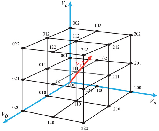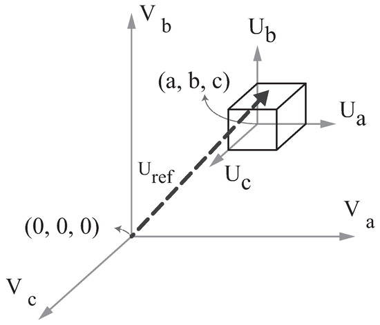 The 3D-SVPWM algorithm allows one to calculate efficiently the commutation sequence by using four state vectors, which are adjacent to the reference vector. The algorithm also determines the respective commutation times for the power electronic devices in the three-level converter [39,40]. The reference vector can be represented by a tetrahedron whose vertices are the state vectors of the switching sequence. Figure 11 shows the generalized 3D space for a three-level NPC inverter. In this figure, 0, 1 and 2 represent the different DC levels, where 0 is the lower DC level, 1 is the connection between the neutral point and each converter phase and 2 is the higher DC level. The multilevel control region is divided into several sub-cubes, and the first step of the modulation algorithm is to find the sub-cube where the reference vector is pointing. Considering this sub-cube using coordinates and changing the origin coordinates to the nearest (0, 0, 0) sub cube vertex, the problem is reduced to a two-level case because the two-level control region is one sub-cube. Therefore, the reference vector is pointing to a tetrahedron. The tetrahedron vertices are the switching sequence state vectors. The modulation algorithm input is a normalized voltage vector. The normalization depends only on the number of inverter levels n and the DC voltage level at the inverter input. The modulation algorithm takes, as the origin, the coordinates (0, 0, 0), so that the standard reference voltage must be displaced, as shown in Figure 12.