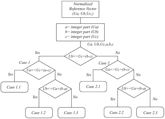 Six tetrahedrons should be studied for each sub-cube. Therefore, it is required to define these possible tetrahedrons where the reference vector can be found. The desired tetrahedron can be easily found using comparisons with the three planes at within the three-dimensional space, which directly defines the six tetrahedrons within the sub-cube. A maximum of three comparisons is necessary to find the desired tetrahedron. Figure 13 shows the six tetrahedrons with corresponding state vectors where the reference vector can be found. The computational load is always the same, being independent of the number of inverter levels.