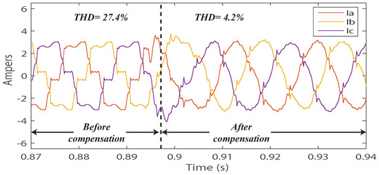 Three phase grid currents before and after compensation.
