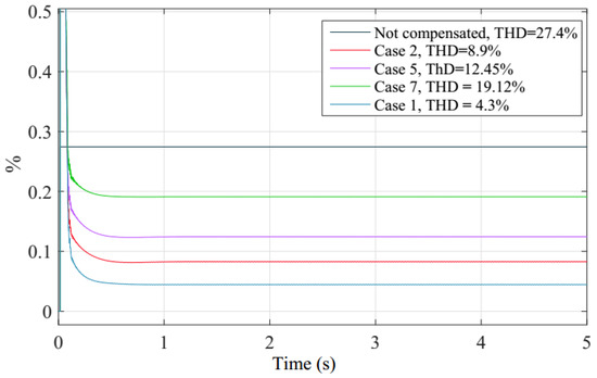 Harmonic distortion for Cases 1, 2, 5 and 7 from Table 2 and grid current without compensation.
