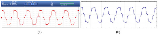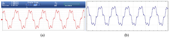 Grid current waveform for Case 2, THD = 10.8%: (a) measured current; (b) simulated current.