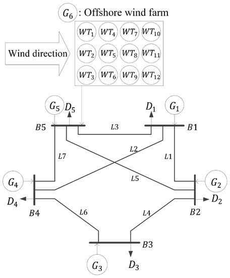 Demand is supplied at each node in the system through Equation (1x), and the transmission capacity constraints are considered through Equation (1y). Each generator has a maximum capacity, and the maximum capacity of the wind farm is the sum of all available power that can be produced by each WT. The produced power of the generators should be less than these constraints and also positive, Equations (1z)–(1ab).