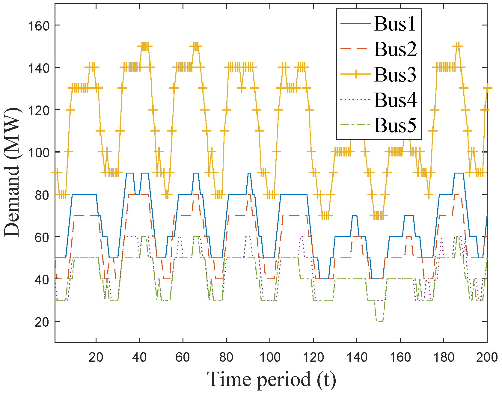 The proposed SMSOWF model in Equation (23) is coded in GAMS v24.7.1 [34] and solved using CPLEX v12.6.2 [35] on a machine running with 144 GB of RAM and an Intel Xeon E5-2660 (2.6 GHz) with two processors (20 cores). A five-bus network (Figure 1) is defined to demonstrate the applicability of the developed SMSOWF model. Details of the generators are provided in Table 1. The inductance and capacity of all transmission lines are correspondingly Ω and 60 MW. The demand profit is shown in Figure 2. The considered operating horizon is for 200 h, where it can be scaled up or modified as required based on days, weeks, etc.