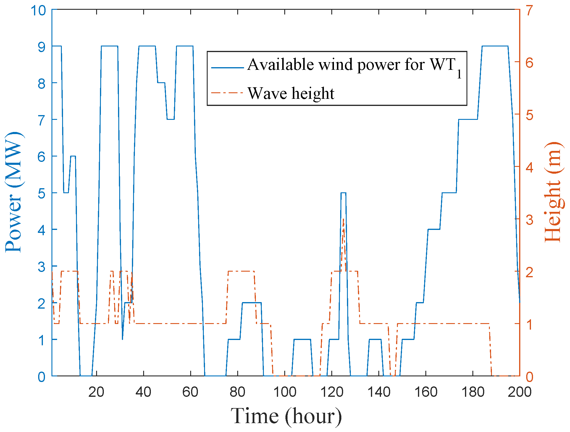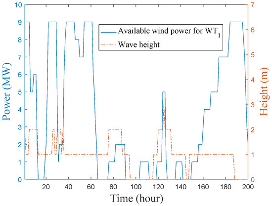 Available wind power and wave height in deterministic cases.