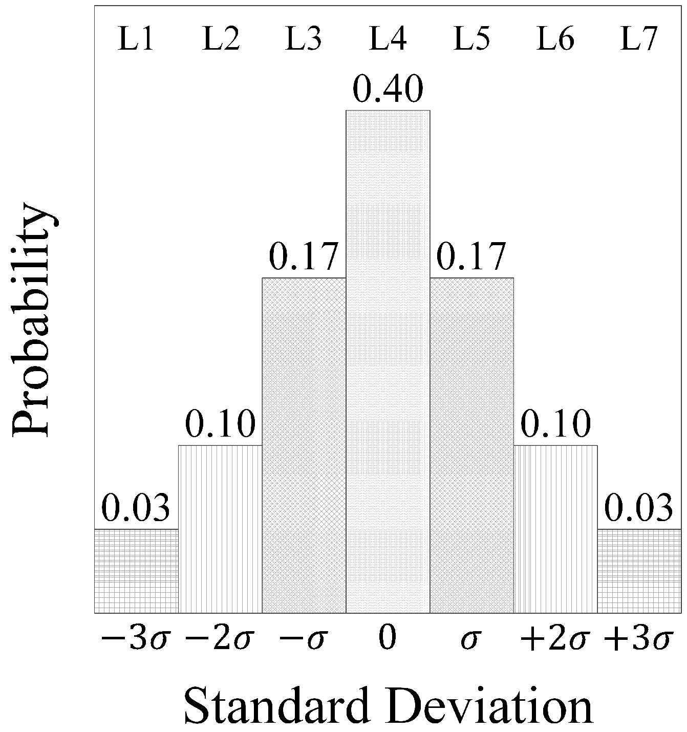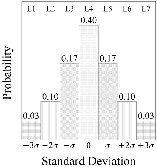 This paper also considers a simplified version of the wake effect in the maintenance scheduling problem. Wind direction is assumed fixed and shown in Figure 1 (wind blows from the west to the east). To add the wake effect, it is considered that the available wind power of each column of WTs reduces as the wind travels through the farm based on the wind direction. Thus, it is assumed that have the hourly maximum available wind power based on Figure 3. This maximum reduces by one unit for , by two units for and by three units for , as displayed in Table 2. These are implemented in the model through the parameter. The wind and wave data can be found online [36], where for simplicity, the wind speed is approximated as output power, as illustrated in Figure 3. To account for variations in the wind and wave in the environment, stochasticity is also considered for them. In this regard, the variations range from −3–+3 standard deviations through seven levels (L1–L7) for each of the wind and wave data. The probability of each level is illustrated as in Figure 4. It should be mentioned that the reference data in the stochastic case (L4) for wind and wave are the data in Figure 3 where the considered standard deviations are 1.00 and 0.15 units for each of the wind and wave data, respectively.