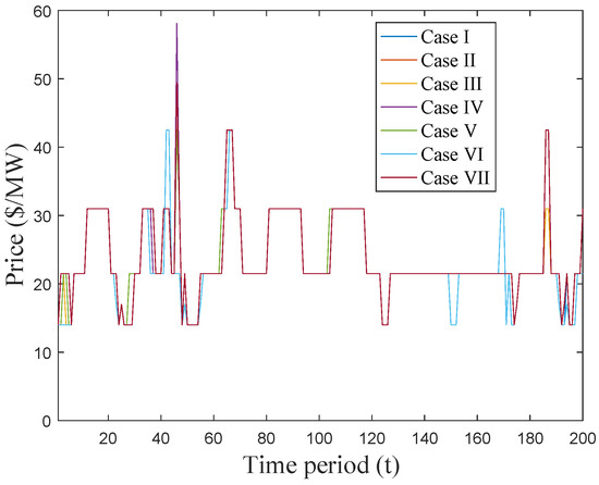 Electricity prices over the study time period for deterministic Cases I–VII.