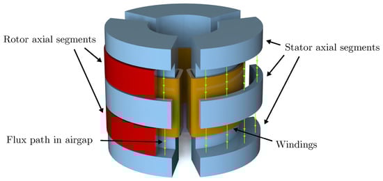 A 3D schematic view of the proposed axial flux switched reluctance machine is shown in Figure 2. The orange windings (seen in the figure) can be magnetized, driving an axial magnetic field in the stator, drawn in blue. At the top and bottom of the stator, the field flows radially, and then axially, into the air gap. The rotor (drawn in red) flux is axial. Note that the machine laminations are not stacked in the same plane, although all electrical steel can be magnetized in a unipolar fashion. The rotor presented in the schematic drawing consists of one pole of laminated (in the -plane) steel spanning 180 and a counterweight made of non-ferromagnetic stainless steel placed on the opposite side (not drawn). Note that more poles can be added in the circumferential direction, to change the torque/electrical frequency ratio. The stator is laminated in the -plane and divided into three phases spaced 120 apart, allowing for more constant torque. The rotor can also be separated axially to increase torque (while also increasing reluctance due to a larger effective air gap). The schematic drawing above contains two axial poles and, thus, four axial air gaps. A 3-1-2 (# of poles for the stator, circumferential rotors and axial rotors, respectively) topology as seen in Figure 2 has the minimum amount of circumferential poles.
