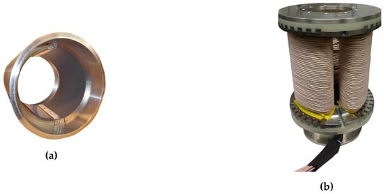 The prototype rotor mainly consists of an outer aluminum (7075-T6) cylinder with electrical- and stainless-steel laminations, each 0.5 thick, covering the inside of the cylinder, seen in Figure 3a. Approximately half of the cylinders’ inner circumference is covered with electric-steel (M350-50A) [] and the other half with stainless-steel (X5CrNi18-10) [] (non-magnetic, acting as a counterweight). The steel densities differed slightly, so the amount of counterweight steel needed was determined by weighing during assembly. Not shown in Figure 3a is the central steel shaft, connected to the rotor through an aluminum disk. The disk has a large external thread with a matching thread found on the inside of the rotor cylinder. The central shaft itself is press-fitted into a hole in the middle of the aluminum disk.