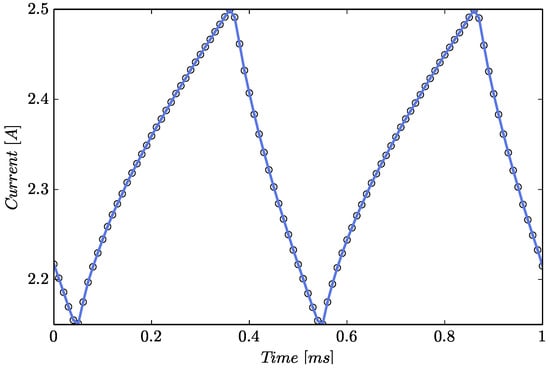 The switching frequency of the current controller was lowered to 2 (from 20 ) for the measurements to increase signal amplitude and increase data point density on the rising and decreasing slopes, as seen in Figure 6. The sample rate was 100 . The current and voltage waveform measured in the winding was fed asynchronously through a high-speed first-in-first-out (FIFO) buffer from the measurement FPGA to a measurement data server for analysis.