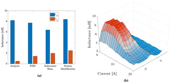 For each point in Figure 8b, 2000 switching periods were recorded per angle and current. The prototype rotor was held fixed at 12 different angles, and the current was measured in steps of 1 from 0 20 . The result of different inductance estimations can be seen in Figure 8a.