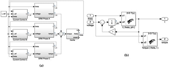 A dynamic simulation was performed in MATLAB Simulink (Mathworks, Natick, MA, USA) in order to estimate performance during higher speeds than the small prototype presented above can sustain. A flux-based state model for each phase was used to describe the system, as seen in Figure 9. The , inductances estimated above were used as inputs to the simulation, together with the saturation behavior found during system identification, to produce lookup tables for the simulation.