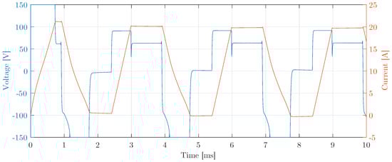 Two simulations were performed, the first one with the prototype presented above and, secondly, one for the full-scale machine presented in Section 2. For the full-scale machine presented in Section 2, the maximum simulated rotational frequency was found to be 334 , which was used for the simulation below. The simulated voltage and current for one phase during motoring in the prototype is seen in Figure 10.
