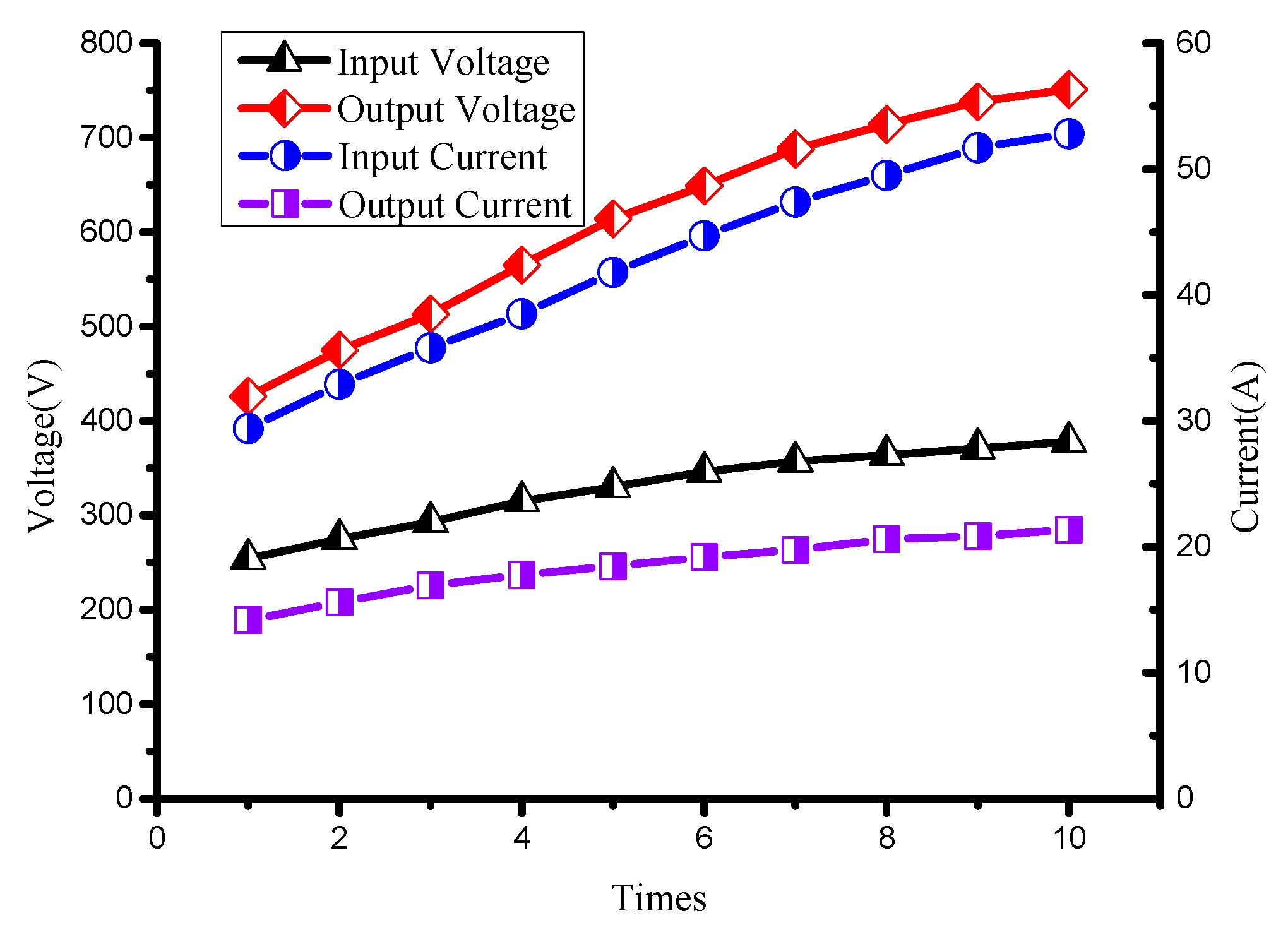 | Input Voltage (V) | Input Current (A) | Input Power (kW) | Output Voltage (V) | Output Current (A) | Output Power (kW) | Transmission Efficiency |