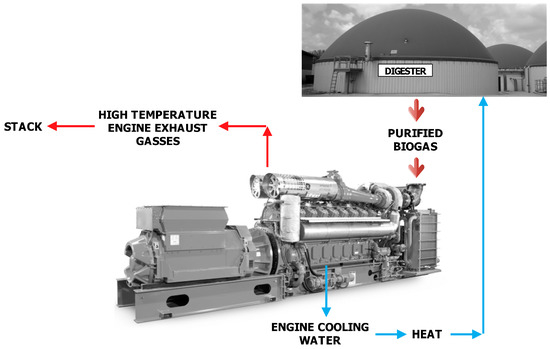 In Italy, the most widespread technology is the spark-ignition engines with a rated power of 1 MWel in which the filtered biogas is burned to produce work. The heat recovered from the engine cooling water is used to maintain the digester required temperature, while the exhaust gases are directly released into the environment with a remarkable waste of heat. A simplified scheme of a biogas plant is depicted in Figure 1.