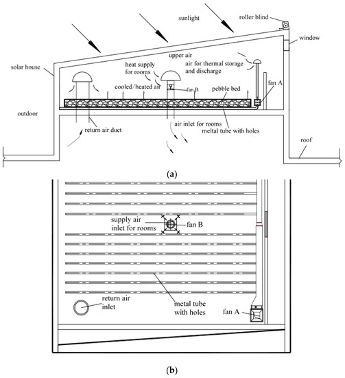 With the heating system, the residence heat load is reduced by passive and active solar energy utilization. For passive application, the roof envelope is improved by the pebble bed and insulated by the attached sunspace. For active use, three operational conditions are presented: (1) in the heat storage period, the upper warm air in the solar attic is extracted through tubes into the pebble bed to get heat exchange by fan A, while fan B is powered off so the energy is stored; (2) when heat supply is needed, fan B is powered on, and the warm air is transported into the room directly; (3) if the air temperature in the solar attic is low but heating is still in demand, fan A is powered on, so energy can be released into solar attic until its air temperature is high enough for heat supply. Furthermore, in case of an airflow short circuit, it is not recommended to run fan A and fan B simultaneously.