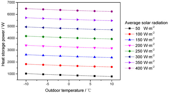 The influence of different solar radiation and exterior temperatures on heat storage power is illustrated in Figure 3. It can be seen that the higher the solar radiation is, the higher the heat storage power is, and a 50 W/m2 rise in solar radiation can increase the average heat storage power by 1 kW. By contrast, the outdoor temperature has less influence on heat storage. From Figure 3, only about 300 W heat storage power is shown when the temperature changes by 20 °C, and when the solar radiation is more than 150 W/m2, the percentage change of heat storage power is less than 5% by per 10 °C variation (seen in Figure 4), so it can be concluded that heat storage performance of the solar attic is independent of outdoor temperature if the solar radiation is larger than a certain value. It should be pointed out that the conclusion is based on the average meteorological data; the detailed data may be different, but the trend should be the same when the practical transient meteorological data is adopted.
