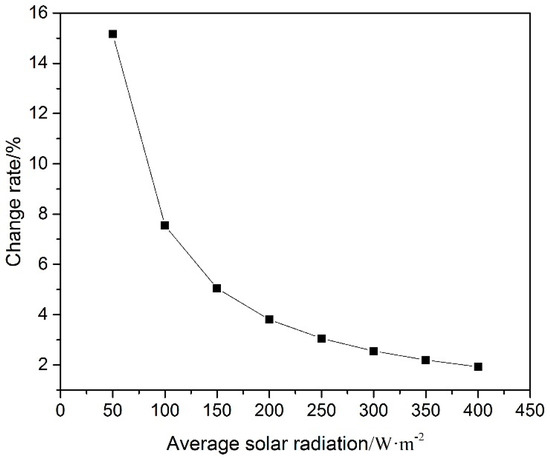 Percentage change of the heat storage power with different average solar radiation when the outdoor temperature varies by 10 °C.