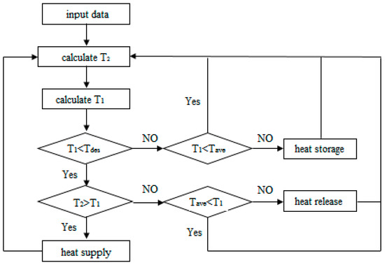 For predicting the operational performance of the proposed heating system described in Figure 1, the typical northwest rural residence investigated by Chen and Liu [29] is regarded as the research target in the above design. The meteorological data is quoted from the specialized meteorological dataset for building Chinese thermal environments [30]. Considering the possible living habits and previous research results, 14 °C is regarded as the design target temperature for a solar residence. In order to obtain the maximum solar energy, the roof of the building is covered completely by a pebble bed with a height of 0.3 m, a length of 12 m, and a width of 4.5 m. The physical parameters of the pebble bed are listed in Table 3. Also, the internal heat source is neglected. The system operational strategy is shown in Figure 5.