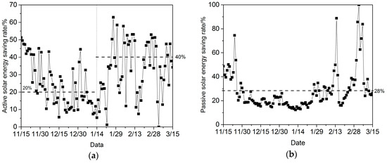 Figure 6 shows the daily active and passive solar energy saving rate during the heating season with the values for daily average wsup, wpa, and wload. The energy saving rate by active utilization of the solar house varies with the outdoor temperature and the solar radiation. During December and early January, because of the low temperature and solar radiation, the average active solar energy saving rate is only 20%. With the increase of temperature and solar radiation in the late heating period, the average active energy saving rate rises to 40% gradually. On contrary, the passive energy saving rate is relatively stable, and the average passive energy rate is about 28% during the heating period. Above all, the overall energy saving rate can get to 56% with the proposed heating system, considering the solar resource in Xi’an; the operational performance is acceptable.
