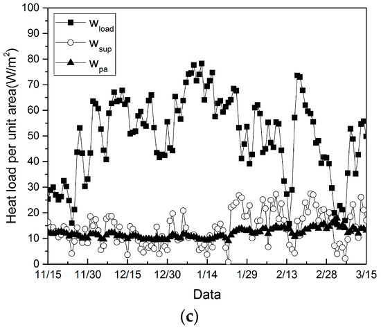 Daily average active (a), passive solar (b) energy saving rate and the actual values for wsup, wpa, and wload (c) during heating season.