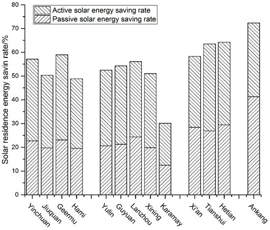 According to a declining sequence by solar energy resources, the cities are divided into four groups as in the horizontal axis from left to right in Figure 8. With the proposed heating system, the energy saving rate can reach 70% in Ankang, though the solar resources in the city are the poorest of the 13 picked cities. Further, the active and passive energy saving rates are 30% and 40%, respectively, which are not lower than those of other cities. The reason is that the outdoor temperature is higher than in other cities so the heat loss by the temperature difference between the solar attic and outdoor air is the smallest. On the contrary, in Karamay, which is rich in solar energy but has a low outdoor temperature, the heating system runs poorly with the energy saving rate of 30%. Therefore, it is not reasonable to evaluating the suitability of the proposed heating system by solar resource.
