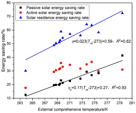 The simulated results showed that there is good linear correlation between the energy saving rate and the external comprehensive temperature, as presented in Figure 9. From that, as the growth of the external comprehensive temperature, the passive and solar residence energy saving rates increase linearly as in Equations (16) and (17), respectively: