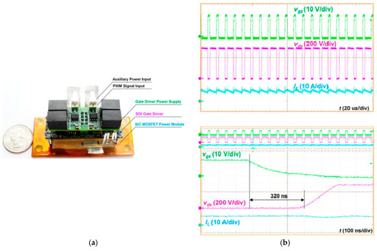 For most applications involving high voltage slew rates at high temperatures, the choice of gate driver becomes a limitation. In many investigations, the SiC module itself was tested inside a high temperature oven, while the gate driver and controls were placed in a lower ambient temperature. This problem was addressed in a 2015 publication by Wang et al. [27], in which a silicon-on-insulator (SOI) gate driver was integrated with a SiC power module. The integrated module shown in Figure 2a was operated at a temperature of 200 °C and a switching frequency of 100 kHz (Figure 2b). This study brings to light the importance and necessity of gate drivers which match the performance of the SiC power devices. A denser integration of the gate driver and the power devices would mean that the driver chip also experiences similar temperatures as the power die.