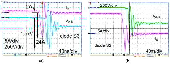 Comparison of reverse recovery transients using (a) Si fast recovery diode; and (b) SiC diode [29]. Reprint with permission [4062730593351]; Copyright 2011, IEEE.