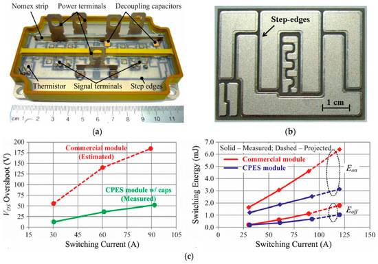 The parasitic ringing and overshoot for this module were reported to be 20% lower as compared with a commercial module even without embedding decoupling capacitors within the module. VDS slew rates as high as 13.9 V/ns were achieved with using a 0 Ω external gate resistor due to the favorable switching transient behavior. The overshoots and switching energy comparison is shown in Figure 4c. No EMI related issues were reported despite the unprecedentedly high voltage slew rates.