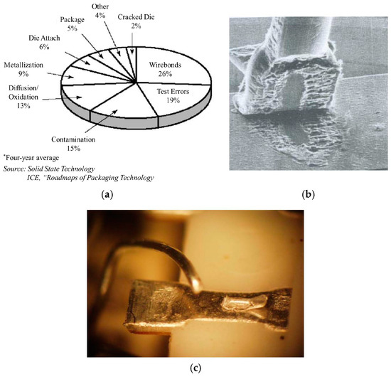 In 2007, Bower et al. [37] documented some of the common issues that were being reported in relation to the failure of SiC modules. Unsurprisingly, wire bond fatigue topped their list, in itself accounting for the most failures associated with a single component (Figure 6a). Figure 6b,c shows the dominant failure mechanisms in wire bonds.
