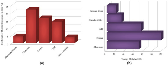 A bar graph comparing the (a) coefficient of thermal expansion (CTE) and (b) Young’s modulus of materials used in a state-of-the-art SiC power module.
