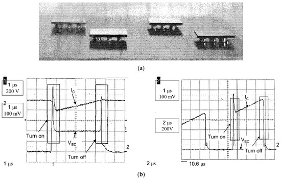 Chip-scale packaging of integrated power modules was explored by Liu et al. [54] in 2001 as a plausible approach to improve the performance of Si IGBT power modules using 3D packaging techniques. Figure 10a shows a photograph of the solder ball bumped devices flip-chipped onto the substrate. An 8.6% percent voltage overshoot was observed for the flip-chip module as compared with 14% overshoot of a commercially available wire bonded module (Figure 10b). The reliability reports suggested that under thermal cycling form 0 °C to 100 °C the resistance of the solder ball interconnects did not degrade after at least 2800 cycles, and that all specimens were functionally intact after 4000 cycles.