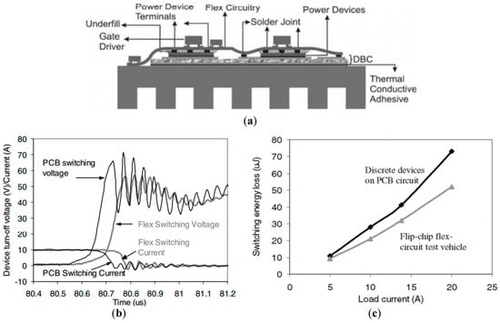Flip-chip on flex package showing (a) a schematic of the package cross-section; (b) the experimental waveforms showing a reduction in the turn-off transients; and (c) the reduction in switching energy losses as a result of wire bondless packaging methods. Reprint with permission [4062750364316]; Copyright 2004, IEEE.