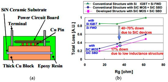 - Horio, M.; Iizuka, Y.; Ikeda, Y.; Mochizuki, E.; Takahashi, Y. Ultra compact and high reliable SiC MOSFET power module with 200 °C operating capability. In Proceedings of the 24th International Symposium on Power Semiconductor Devices and ICs, Bruges, Belgium, 3–7 June 2012; pp. 81–84.