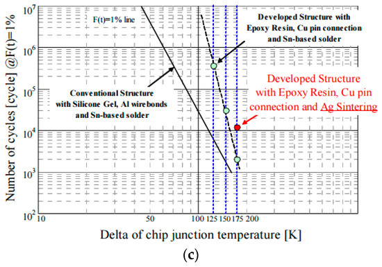 The thermal resistance offered by this packaging scheme was also lower than an aluminum wire bonded module; and the least thermal resistance was realized by using liquid cooling. From failure analysis results, it could be ascertained that the failure occurred at the junction between the copper interconnect layer and the silicon power device. The onset of failure, however, was much delayed as compared with an aluminum wire bonded module. This was attributed to the fact that copper was a relatively better match to silicon with regard to the CTE as compared to aluminum. Another reason was because this interconnect technology had a larger surface area of contact with the power die and thus the thermomechanical stresses were distributed more uniformly. This was one of the only studies that published a comprehensive reliability analysis to quantify that this approach met industry standards.