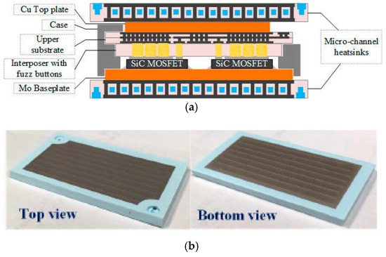 Wide band gap (WBG) power devices are dictating the pace of development of power electronics today. There has been considerable advancement in the field of WBG semiconductor power devices. These have the benefits of enabling a high power density at high junction temperatures, coupled with faster switching speeds as compared with their silicon (Si) counterparts [1,2,3,4,5,6]. Thus far, silicon carbide (SiC) [1,2,3] and gallium nitride (GaN) [4,5,6] have been the materials of choice for most WBG modules. While GaN is the preferred choice in applications requiring <500 V, SiC excels in applications exceeding 900 V. SiC devices rated 900 V and above are available in chip sizes spanning just tens of square millimeters. In addition, the switching losses associated with SiC are much lower than the values reported for silicon power devices. SiC devices can be switched at higher frequencies resulting in filtering circuits that occupy less package real estate than their silicon counterparts.