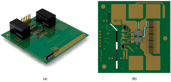 The integrated wire bondless half bridge incorporating chip-scale packaged MOSFETs showing a rendering of (a) the top view of the printed circuit board (PCB) with the gate driver, passives, and power supplies; and (b) the bottom view showing the MOSFETs and decoupling capacitors.