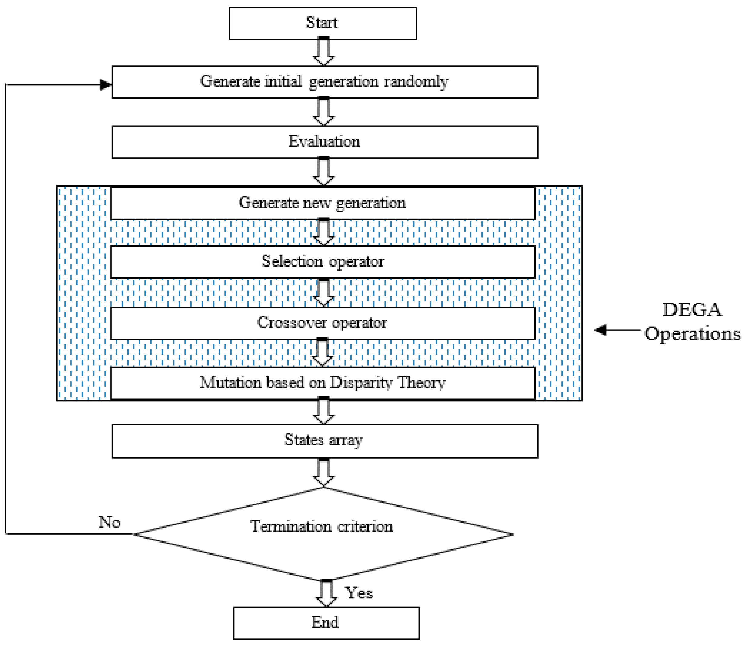 Figure 2 describes the proposed method, DEGA, which comprises of an improved mutation operator which adopts the modeling disparity theory of evolution as its method of the reproduction of genes.