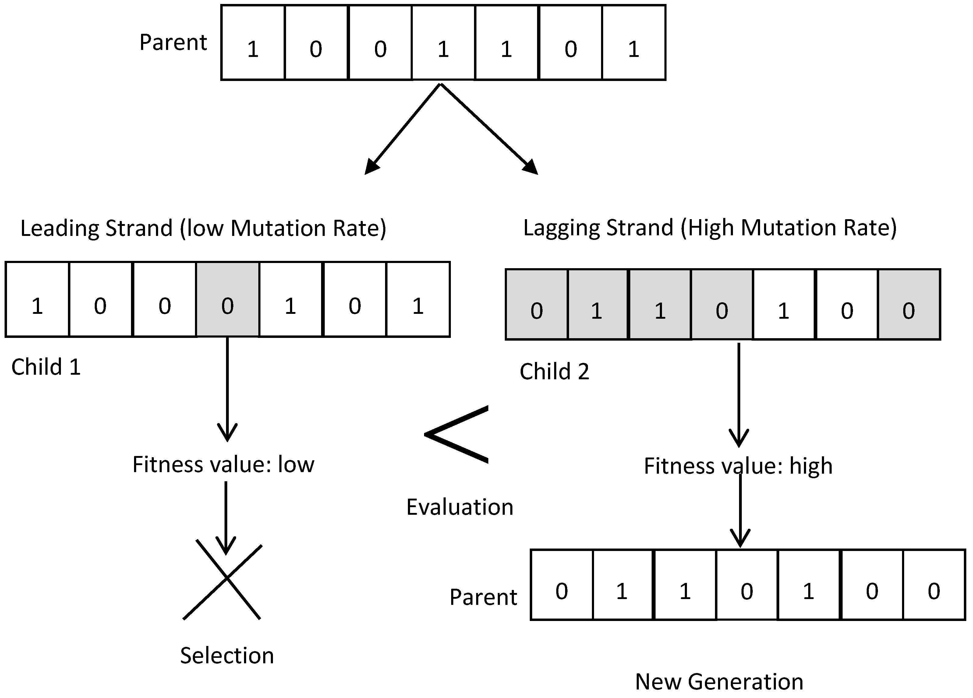 By using DEGA, one parent’s chromosome can create two children, which occurs from the mutation of the (le) and (la) strands. Half of the child’s chromosome is selected as the population doubles in one step of the generation [18].